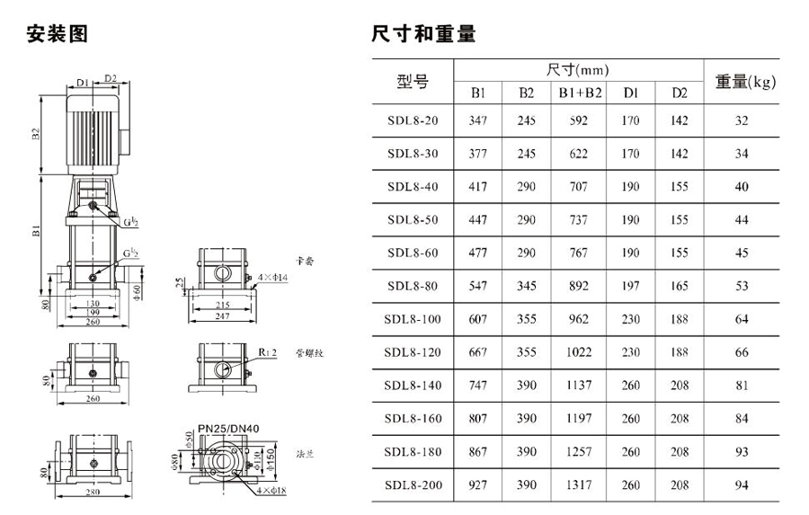 南元SDL8/SDLT8立式多級離心泵有不同的泵規格和不同級數,以滿足所需的流量和壓力。