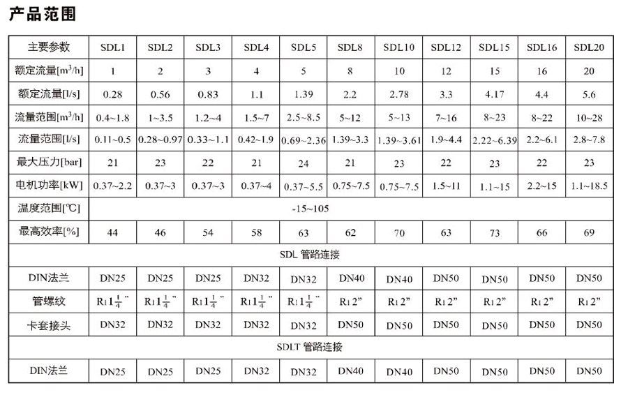 SDL8/SDLT8是一種多功能產品,可以輸送從自來水到工業液體的各種不同介質,適用于不同溫度、流量和壓力范圍。