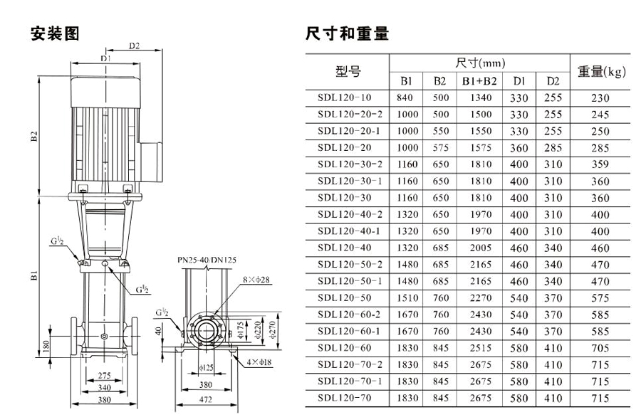 SDL120/SDLT120為配用標準電機的非自吸立式多級離心泵,電機軸和泵軸用聯軸器直接聯接,把拉桿用螺母將外筒,過流部件固定在支架和進出水體之間,泵進出水口在泵底部的同一直線上。泵可根據需要配置智能保護器,對泵的干轉、缺相、過載等進行有效的保護。